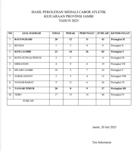 Sabaknews.co|Tanjab Timur- Kembali salah satu tenaga pendidik di salah satu sekolah SDN 165/X Catur Rahayu ukir prestasi pada Kejuaraan Provinsi (Kejurprov) Atletik di Kota Jambi yang diselenggarakan pada 17 sampai 20 Juli 2025 bertempat di Stadion Tri Lomba Juang Koni Jambi.