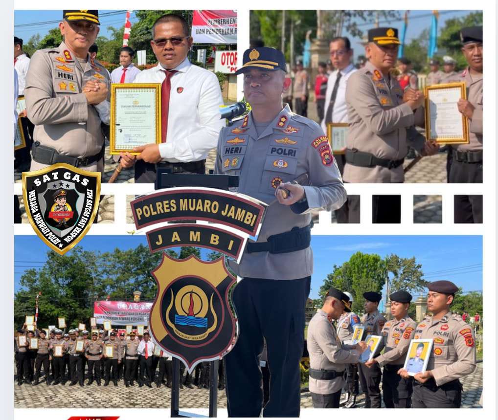 Untuk Personel Polres Muaro Jambi yang pada hari ini mendapatkan Reward hal ini merupakan suatu bentuk perhatian dari Pimpinan kepada anggota yang memiliki Dedikasi tinggi dalam melaksanakan Tugas Juga Berprestasi mengharumkan Nama Polri Khususnya Polres Muaro Jam i dan Saya harapkan momentum seperti ini bisa menjadi motivasi bagi rekan – rekan yang lain serta selalu menjaga kinerja lebih baik dalam hal pelaksanaan tugas kedepanya.