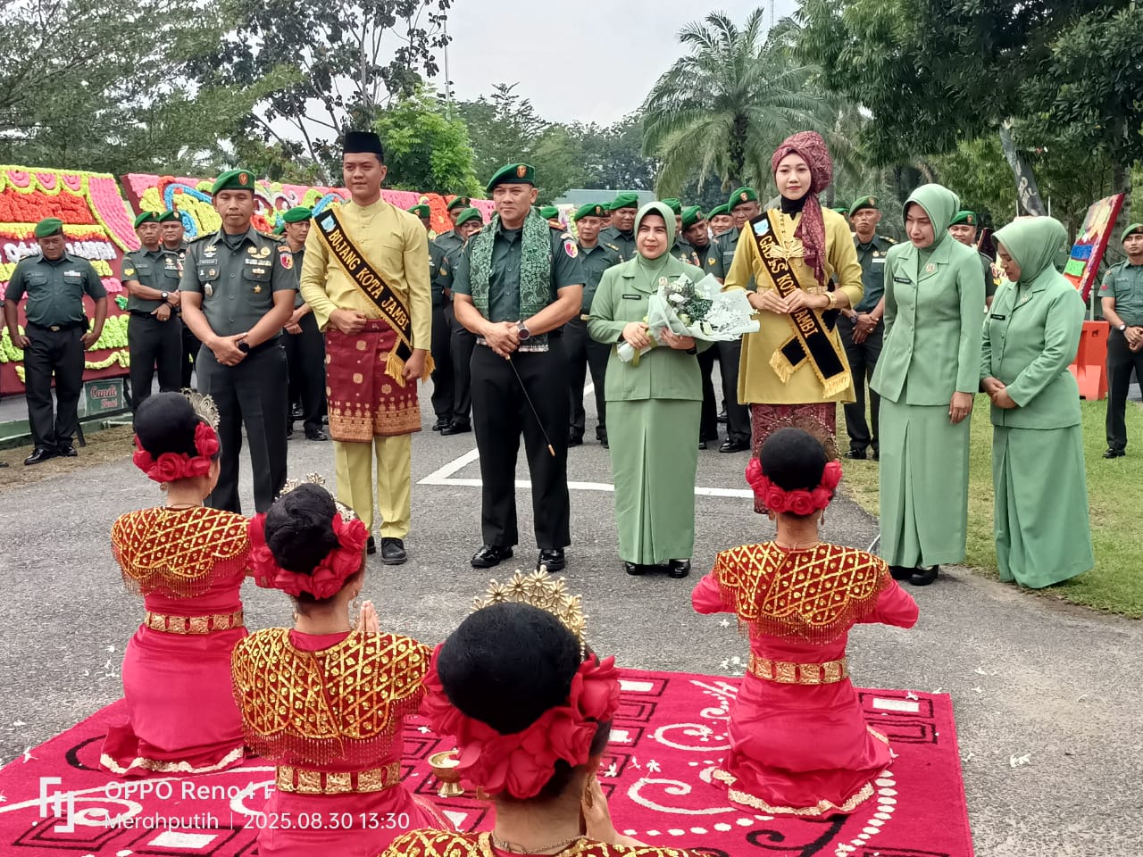 Tradisi penyambutan adat Jambi berupa tarian sekapur sirih dan pedang Pora serta pengalungan syal kepada Dandim 0415/Jambi yang baru beserta Istri