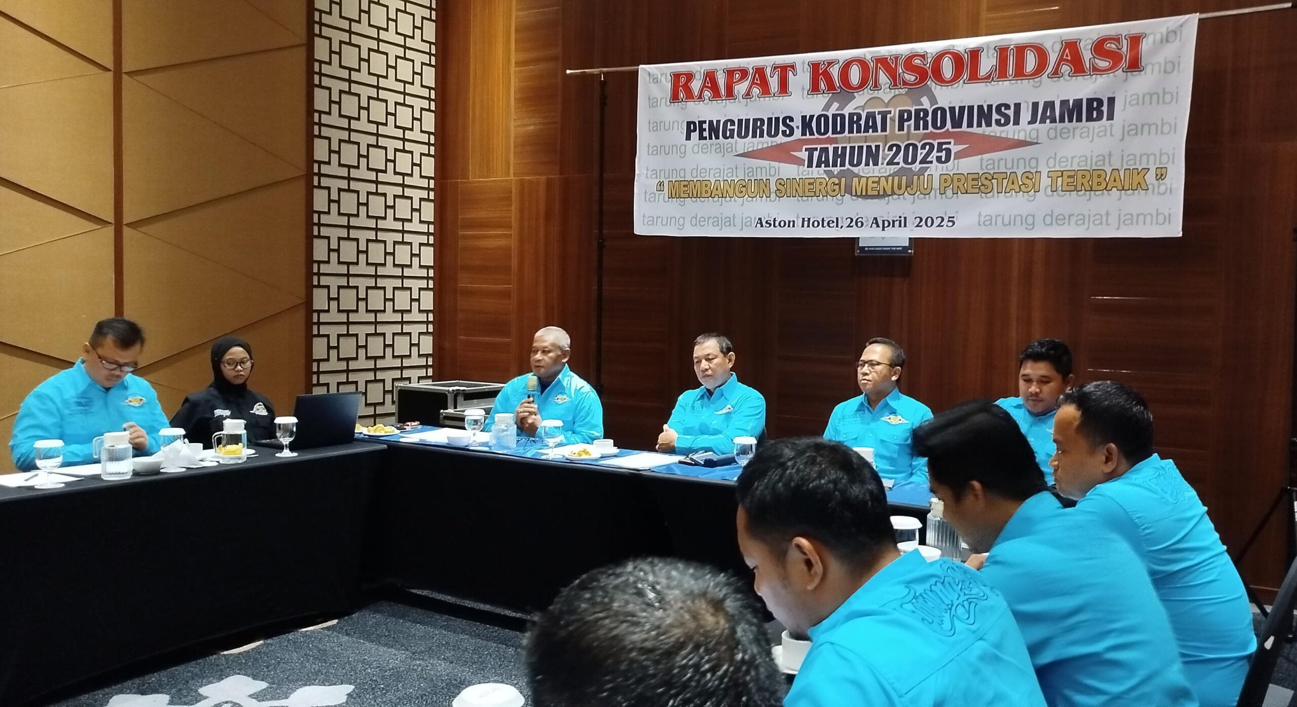 Sabaknews.co|Jambi Dalam rangka silaturahmi dan persiapan beberapa event Tarung Derajat di Provinsi Jambi, Sabtu 26 April 2026. Rapat yang diselenggarakan di Hotel Aston Jambi tersebut dipimpin langsung oleh Ketua Umum KODRAT Provinsi Jambi Yuzar Brian yang didampingi Ketua Harian Engkos Kosasih dan dihadiri oleh Pengurus Kabupaten/Kota se-Provinsi Jambi.