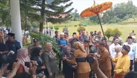 Bupati memasuki area lapangan Kantor Bupati disambut dengan kompangan dan tarian adat Melayu juga disambut oleh para ASN dengan saling bersalaman dengan diikuti tarian sekapur sirih.