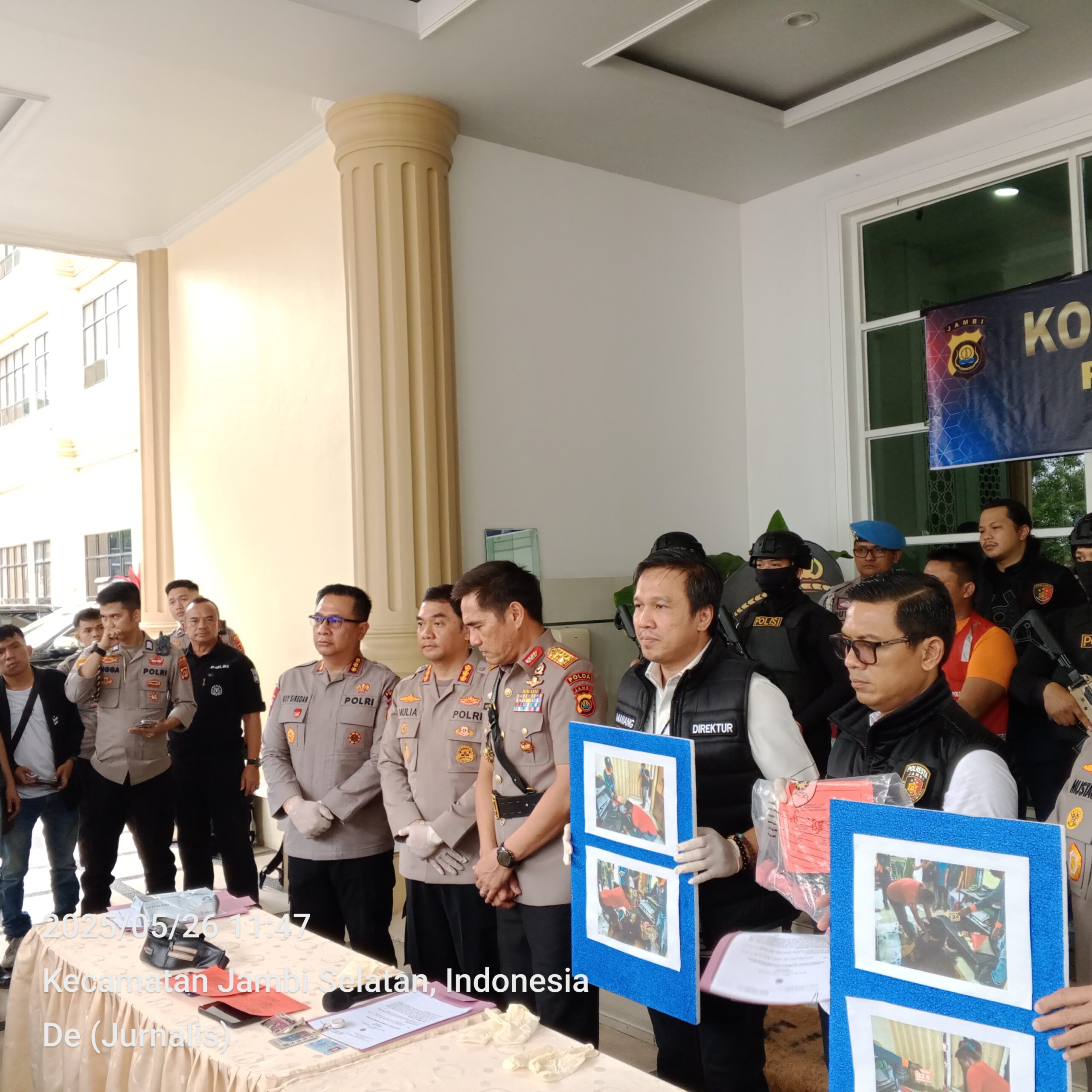 Sabaknews.co|Jambi Bertempat di lobi utama Polda Jambi konferensi pers yang di pimpin Kapolda Jambi Irjen Pol Krino H Siregar di dampingi Ditreskrimum Polda Jambi Manag Soebety, Kapolresta Jambi Kombes PoL Boy Siregar ,Kabid Humas Polda Jambi Kombes Pol Mulia.