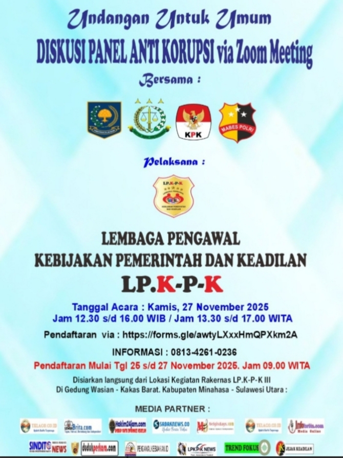 Sabaknews.co|Minahasa- 25 November 2025 — Dalam rangka mendukung penguatan gerakan antikorupsi di Indonesia, Lembaga Pengawal Kebijakan Pemerintah dan Keadilan (LPKPK) mengundang masyarakat luas untuk mengikuti Diskusi Panel Anti Korupsi yang akan dilaksanakan secara daring melalui Zoom Meeting pada Kamis, 27 November 2025.