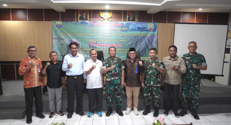 Sabaknews.co|Jambi Dalam upaya memperkuat ketahanan pangan Nasional, dilaksanakan penandatanganan Memorandum of Understanding (MoU) antara Kepala Dinas Tanaman Pangan, Hortikultura dan Peternakan (TPHP) Provinsi Jambi, Ir. Rumusdar, dengan Danrem 042/Gapu Brigjen TNI Heri Purwanto, S.E., M.Sc., pada Kamis (16/10/2025) pukul 10.30 WIB di Aula Kantor Dinas TPHP Provinsi Jambi, Jalan Lingkar Barat KM 12 Kota Baru, Jambi. Kegiatan tersebut juga dirangkai dengan penandatanganan kontrak konstruksi cetak sawah rakyat (CSR) antara Pejabat Pembuat Komitmen (PPK) Dinas TPHP Kabupaten Sarolangun dengan Dandim 0420/Sarko, Letkol Inf Yakhya Wisnu Arianto, S.Sos., M.Han.